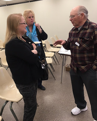 Assemblywoman Addie A.E. Jenne talks with Joseph Lamendola Friday night at a Jefferson-Lewis Counties chapter of SCOPE events at the Dulles State Office Building in Watertown.